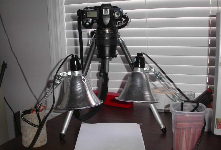 Setup: I thought that since my desk was much cleaner than usual, I'd do a quick photo of my setup. I use a small, but heavy, metal tripod which has had it's lower leg segments removed. It is positioned on my desk right next to my monitor for easy use. I've attached my Nikon D70 with a 18-70mm Nikkor zoom lens to the tripod. The camera's usb cable is attached to the camera body, and is thentaped to the edge of the desk (outside photo area). A seperate USB extension cable runs from there to the computer, allowing my to plug in the camera and unplug it from the computer without touching the camera. This is useful, since when the usb is hooked into my computer, I can't take photos (I'm too cheap to pay $50+ for Nikon's software). ![]() My photography has improved quite a bit since I started, but I still have a ways to go. Still, this setup has given me some nice photos over the last few months. I'm enjoying learning more as I go. Probably the next purchase I need to make this a better setup would either be a better macro lens (my zoom lens doesn't quite give me the crispness I desire) or a proper copystand, which would give me more room to reposition my lamps to get the lighting to work right on coins I photograph. Approximate Costs: Tripod: Free (giveaway); cost to buy, used, $15-$20 Phillips Natural 60 W lamps: $8-$10, 4 pack 5" Shop light reflectors: $5/ea Nikon D70 Digital SLR body: $450 - $550, used on eBay (12/2006) Nikkor 18-70mm Zoom lens for D70: $150 - $200, used on eBay (12/2006) As you can see, the main cost was (obviously) my digital camera. Luckily, my father was kind enough to give it to me as a college graduation present. A number of other people shoot with other, cheaper cameras and get quite good results, so don't let the camera cost hold you back! Copyright Notice: This article is copyright (c) 2006 by Michael C. Parrish. All rights reserved. If you wish to duplicate this article, please contact Michael via email at: pendragon1998@yahoo.com. |